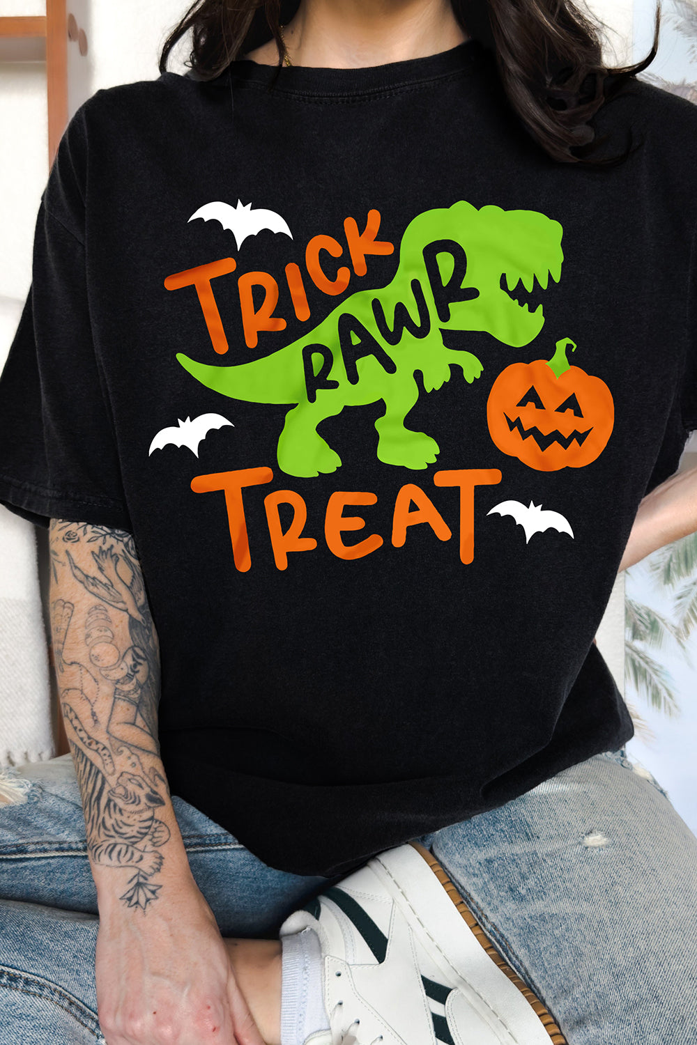Trick Rawr Treat Dinosaur Funny Halloween T-Rex with Pumpkin Tee For Women