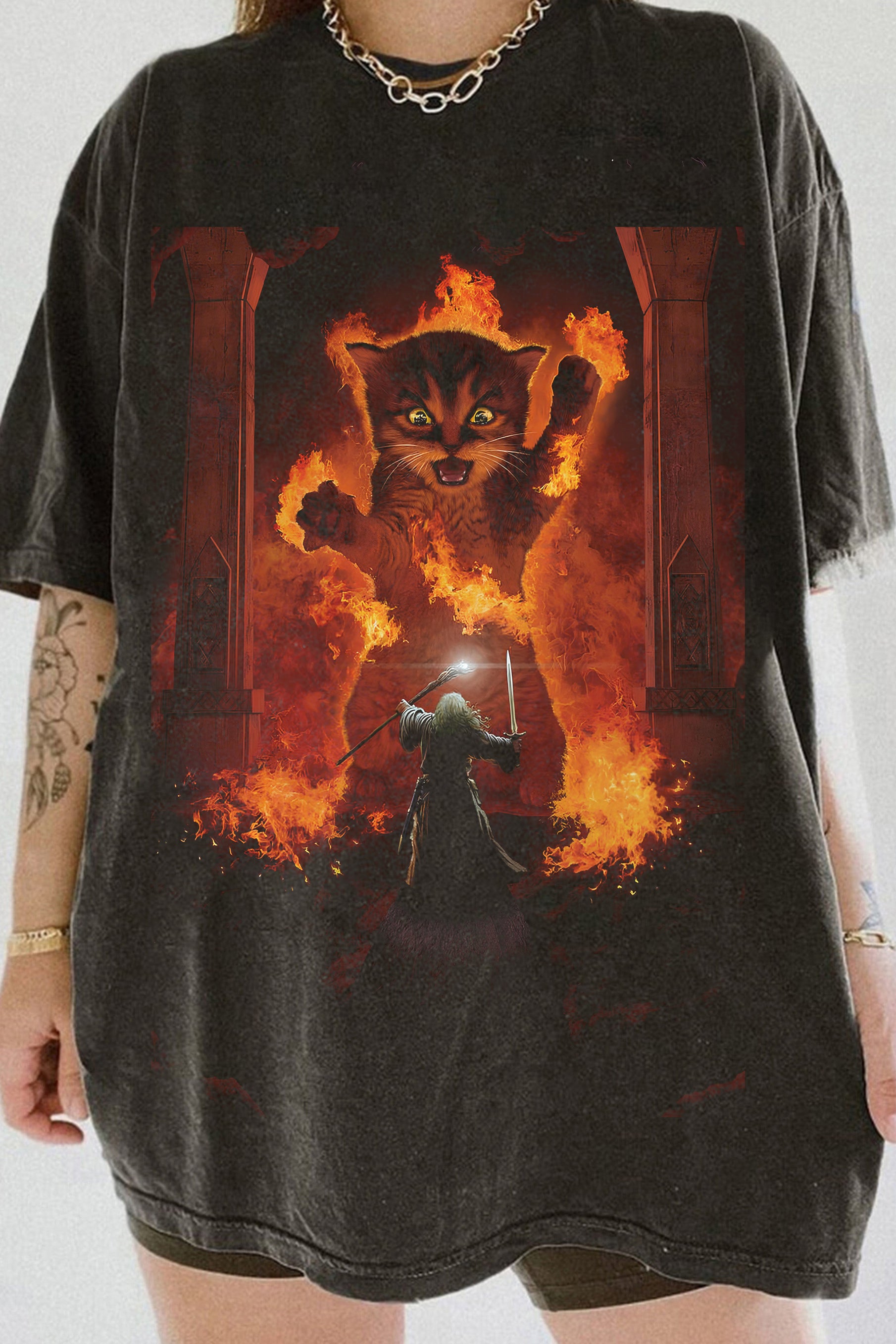 Cats Kittens Kitty You Shall Not Pass Fire Flames Gandalf Catdalf Frodo Lord of the Rings Tee For Women
