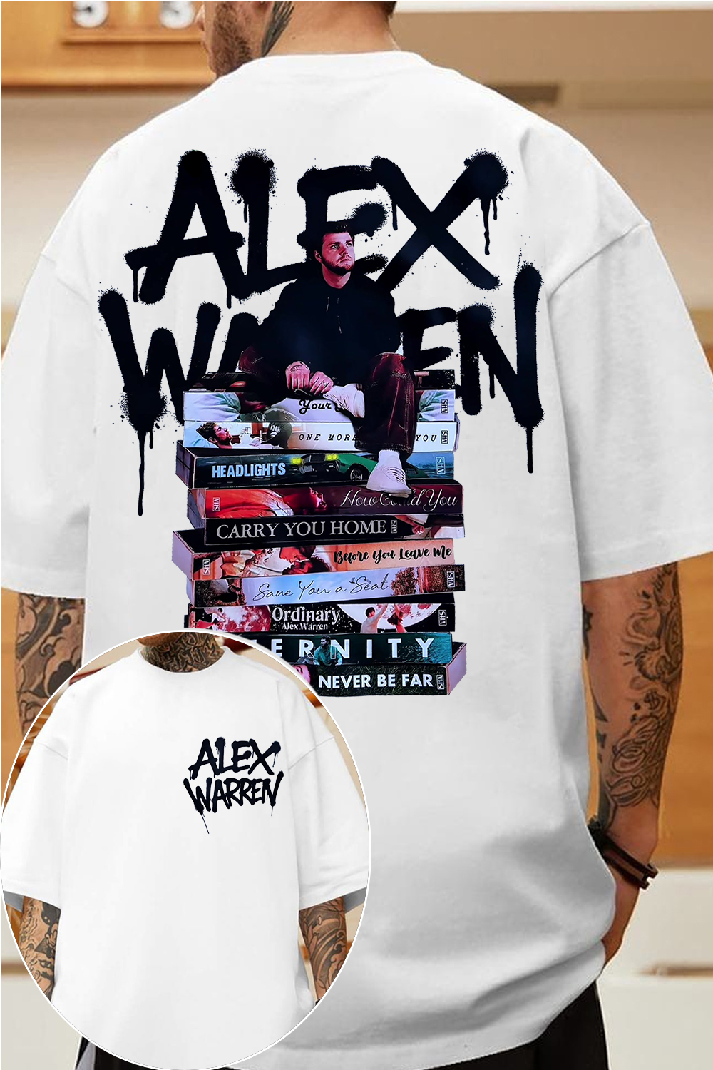 The design of this Alex Warren Shirt takes its inspiration from his musical works. The stacked covers resemble a series of “diaries” that record his inner journey, showcasing his depth as an artist. The figure of Alex Warren sitting atop them symbolizes music as both his foundation and his stage. Combined with the graffiti-style logo, the design creates a unique street-art vibe.