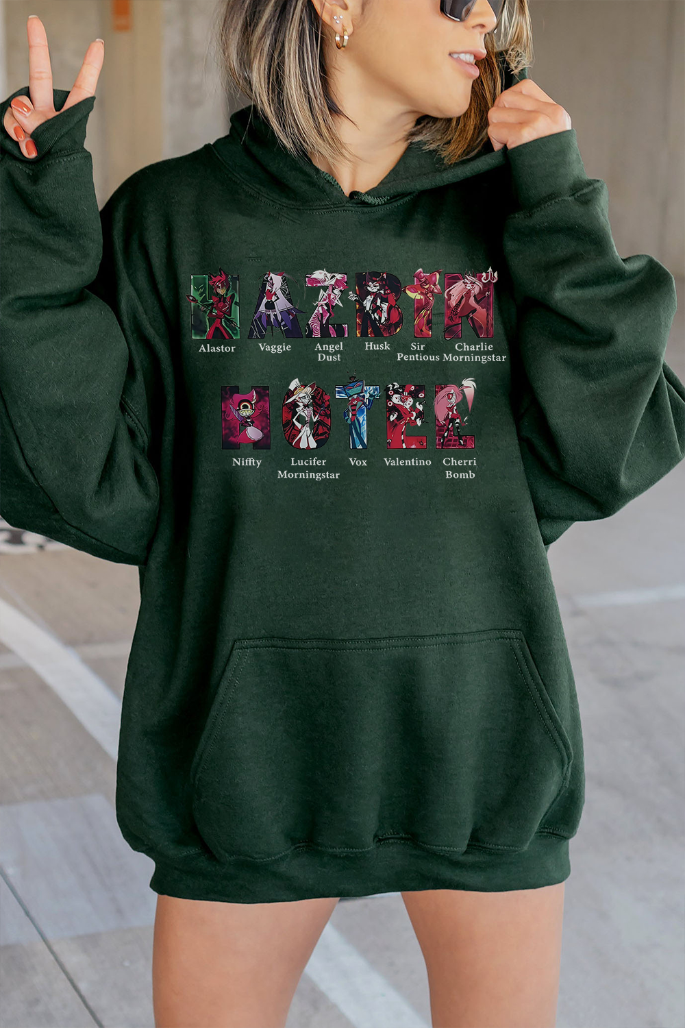 - Concept: Design a Hazbin Hotel character collage sweatshirt showcasing the diverse and vibrant characters from the animated series Hazbin Hotel.